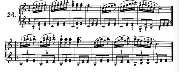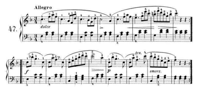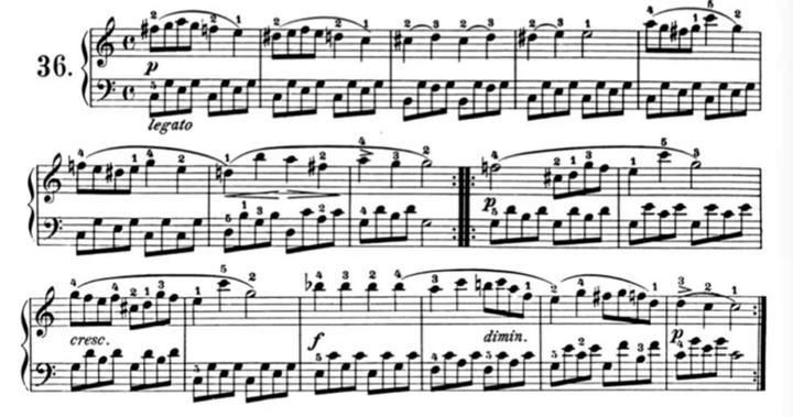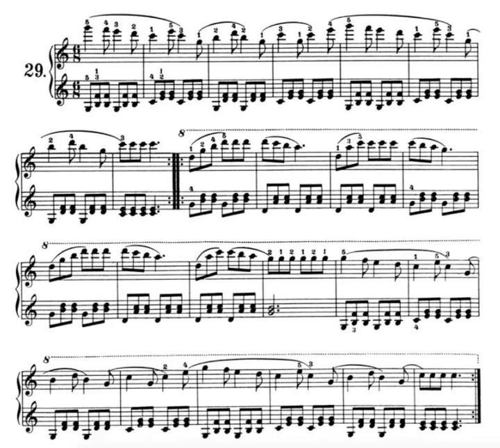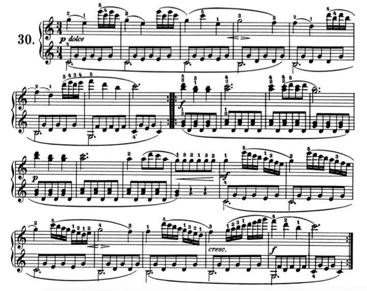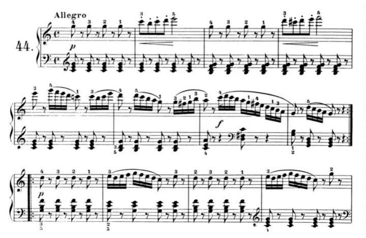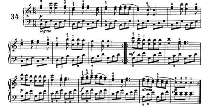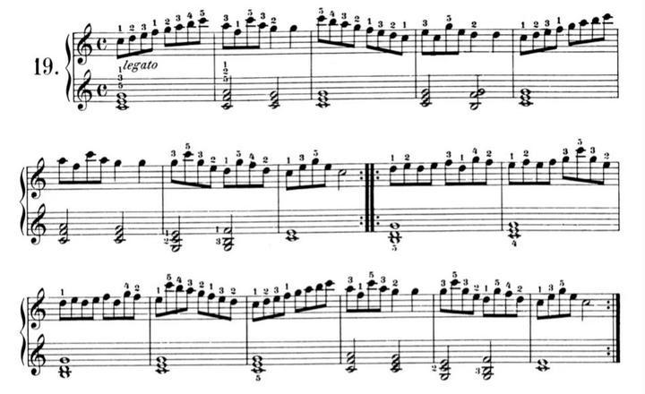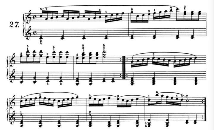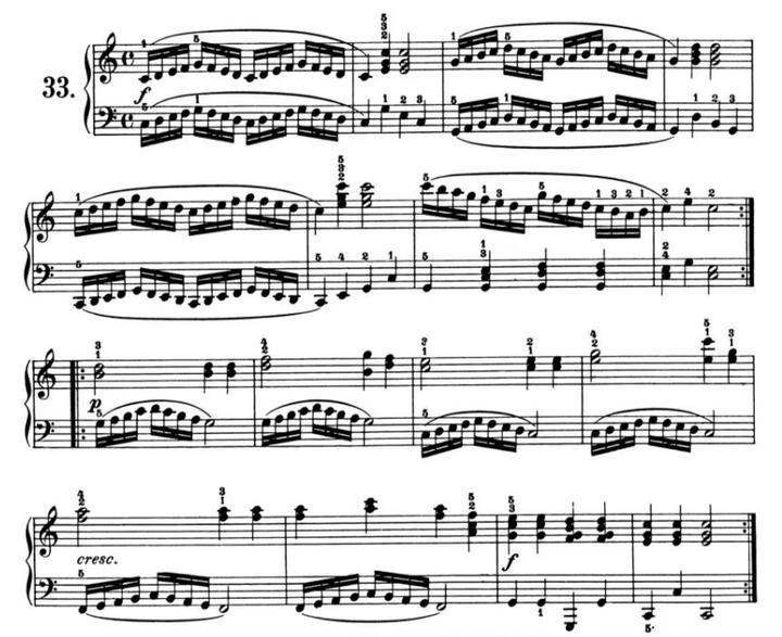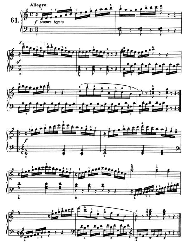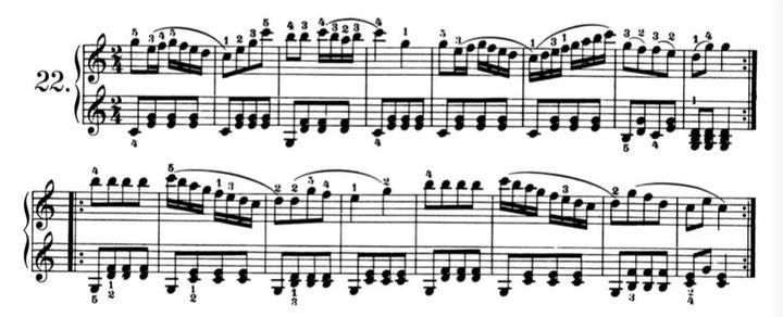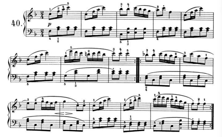 值得一提的是,车尔尼599中的练习曲并非都需要逐首练习,因为它们中有些技术内容是重复的。此外,教材中的曲目是按照车尔尼的创作顺序排列的,因此在练习时应该有所取舍,选择合适的顺序。下面提供一个建议的难易程度顺序供学习者参考: