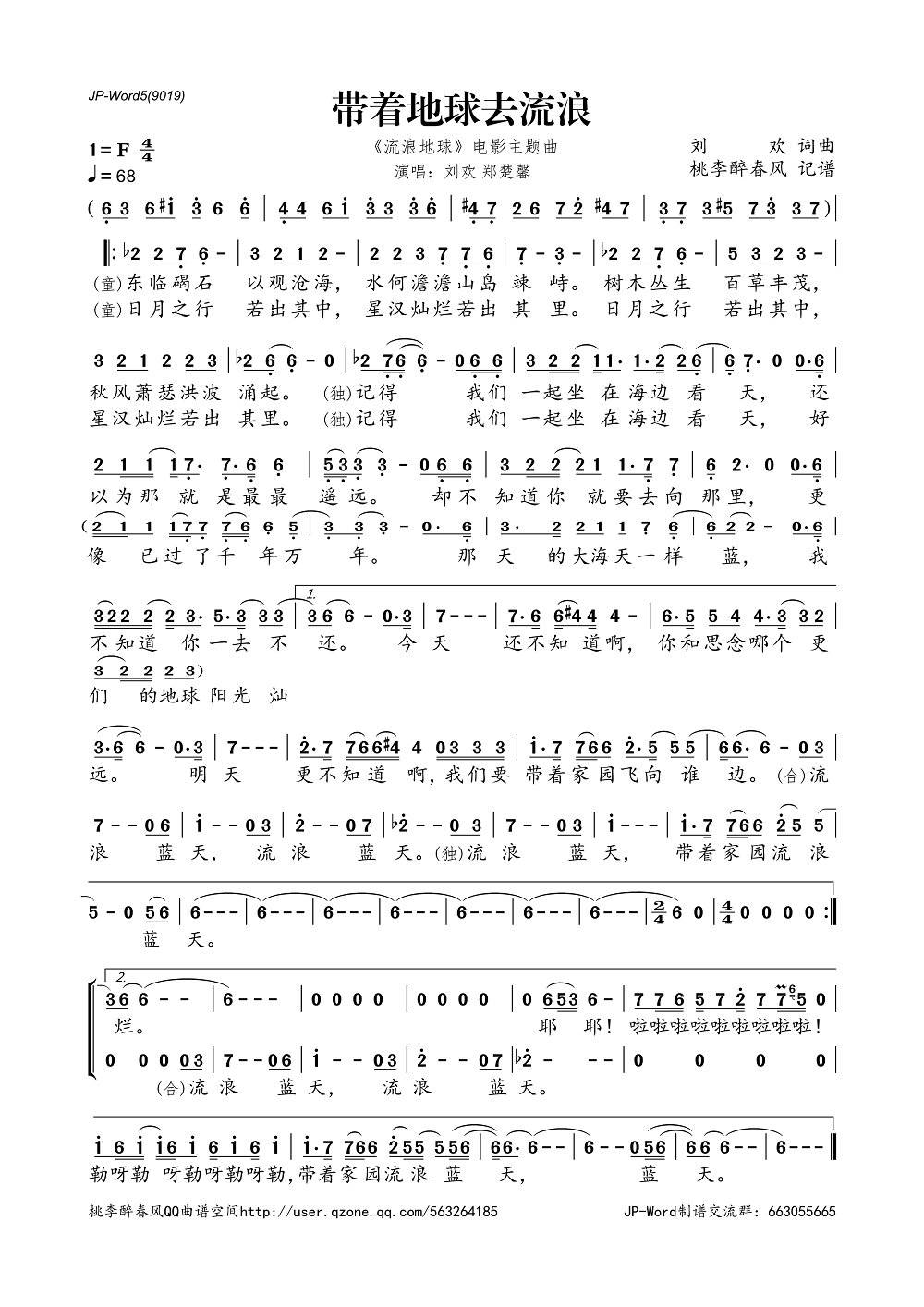 带着地球去流浪(《流浪地球》电影主题曲 )(简谱)
