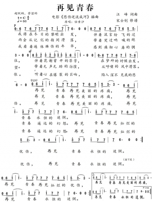 >>再见青春(电影《悲伤逆流成河》插曲)(简谱)