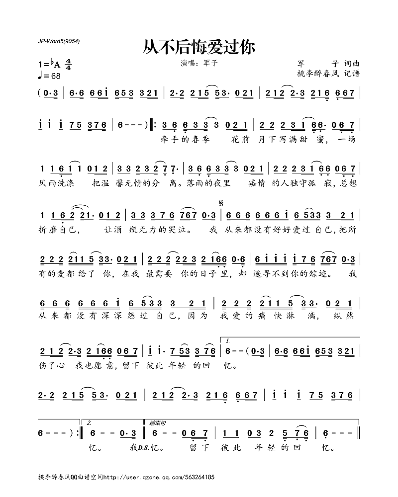 从不后悔爱过你(简谱)