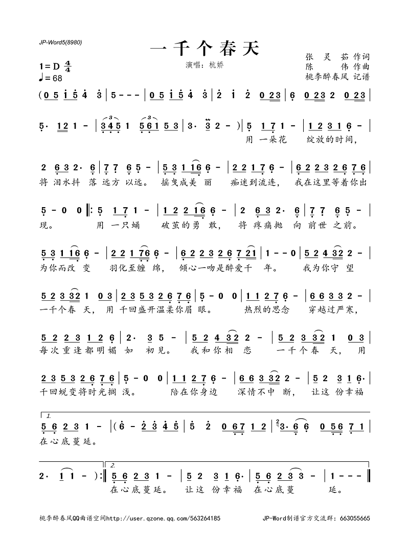 >>一千个春天——杭娇(简谱)