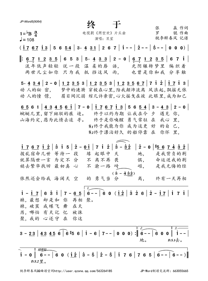 >>终于(电视剧《两世欢》片头曲)(简谱)