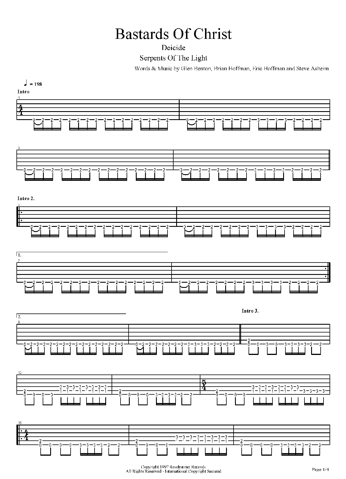 电吉他练习谱《Deicide - Bastards Of Christ》简谱五线谱附歌词是乐器资源网于2017年04月01日 18:19:53整理更新,内容收录在电吉他乐谱栏目;乐器资源网免费分享专业、准确、规范、高清的电吉他乐谱简谱五线谱歌词等电子版资料,欢迎在线免费下载;乐器资源网无需注册会员,即可直接免费下载各类乐器学习相关资源。