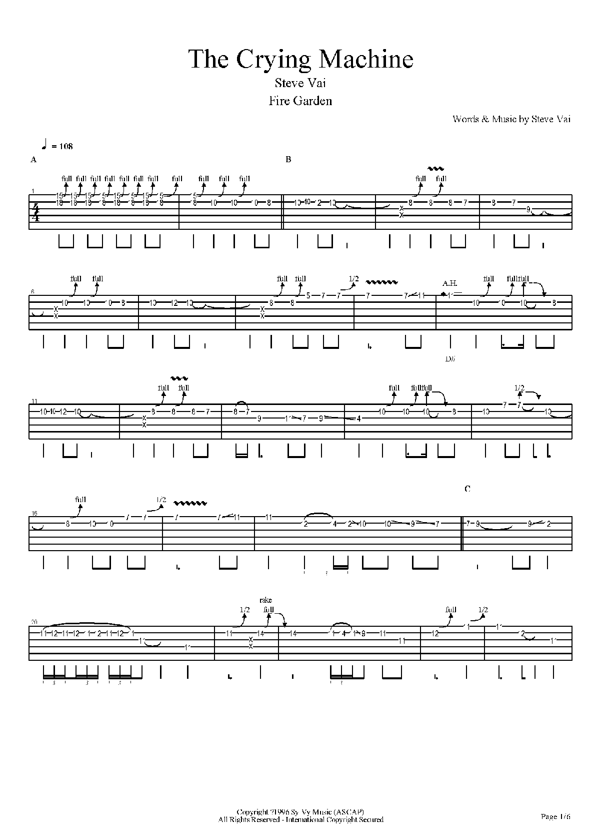 电吉他练习谱《Vai, Steve - 哭泣的机器》简谱五线谱附歌词是乐器资源网于2017年04月01日 21:15:05整理更新,内容收录在电吉他乐谱栏目;乐器资源网免费分享专业、准确、规范、高清的电吉他乐谱简谱五线谱歌词等电子版资料,欢迎在线免费下载;乐器资源网无需注册会员,即可直接免费下载各类乐器学习相关资源。