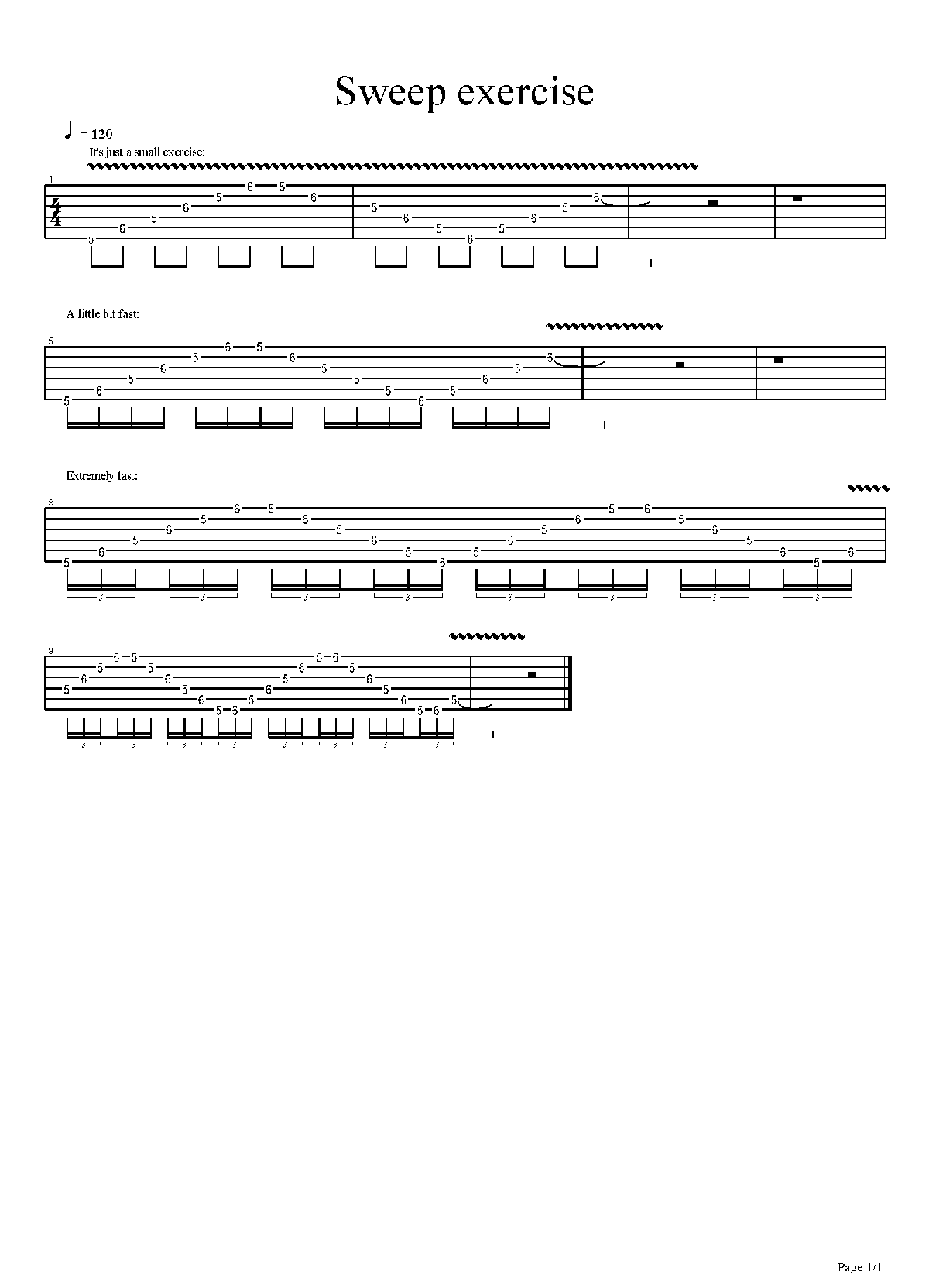 Sweep Excercises - Sweep exercise简谱五线谱附歌词是乐器资源网于2017年04月02日 11:10:24整理更新,内容收录在电吉他乐谱栏目;乐器资源网免费分享专业、准确、规范、高清的电吉他乐谱简谱五线谱歌词等电子版资料,欢迎在线免费下载;乐器资源网无需注册会员,即可直接免费下载各类乐器学习相关资源。