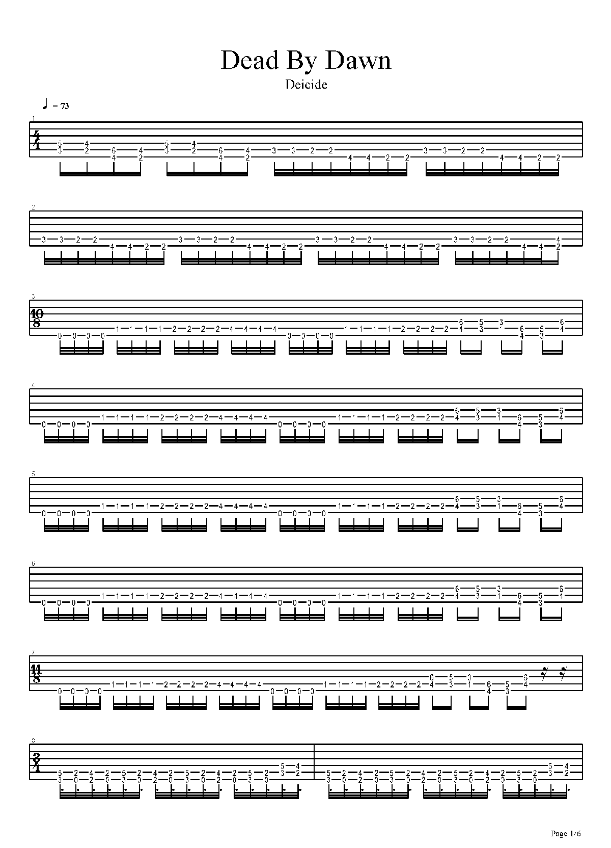 电吉他练习谱《Deicide - Dead By Dawn》简谱五线谱附歌词是乐器资源网于2017年04月01日 18:21:08整理更新,内容收录在电吉他乐谱栏目;乐器资源网免费分享专业、准确、规范、高清的电吉他乐谱简谱五线谱歌词等电子版资料,欢迎在线免费下载;乐器资源网无需注册会员,即可直接免费下载各类乐器学习相关资源。