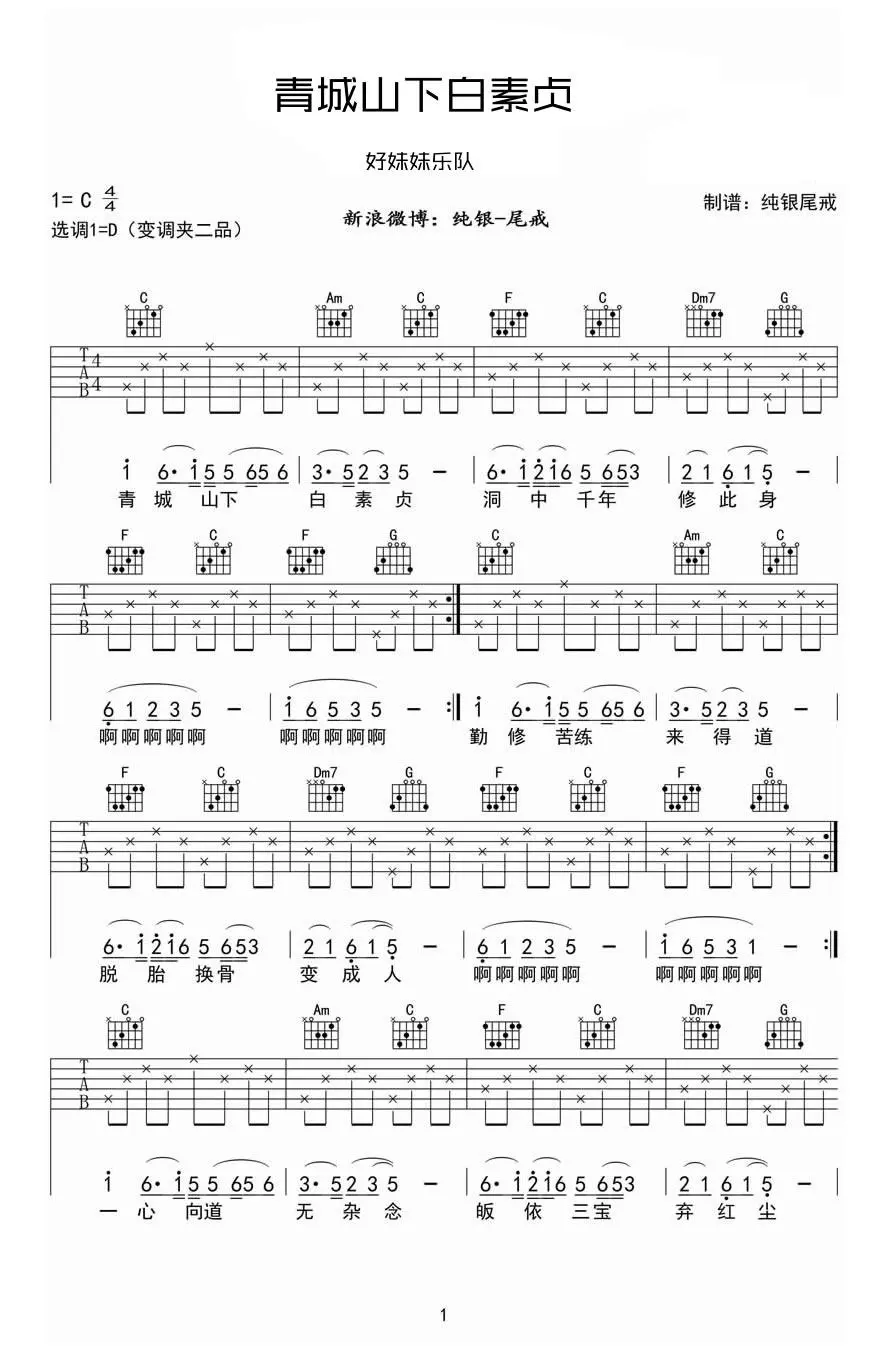 《青城山下白素贞》好妹妹乐队翻唱版本吉他谱,歌曲原唱庄惠茹。是由贡敏作词,左宏元作曲,是1992年电视剧《新白娘子传奇》的插曲,2012年好妹妹乐队发布翻唱版本,收录在专辑《春生》中。吉他谱选用C调指法编配,演唱时变调夹夹2品转D调,共2张图片谱,由纯银尾戎编配制谱出品。