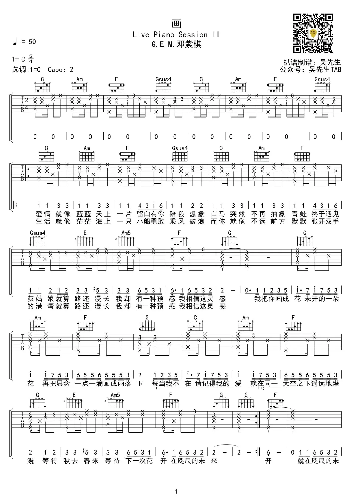 邓紫棋《画》吉他谱,由邓紫棋创作词曲及演唱的一首歌,2016年发布,是其现场钢琴录音系列作品《Live Piano Session Ⅱ》中的第二首单曲。歌曲原调D调,吉他谱选用C调指法编配,演唱时变调夹加2品,共二张图片谱,由吴先生编配制谱出品。