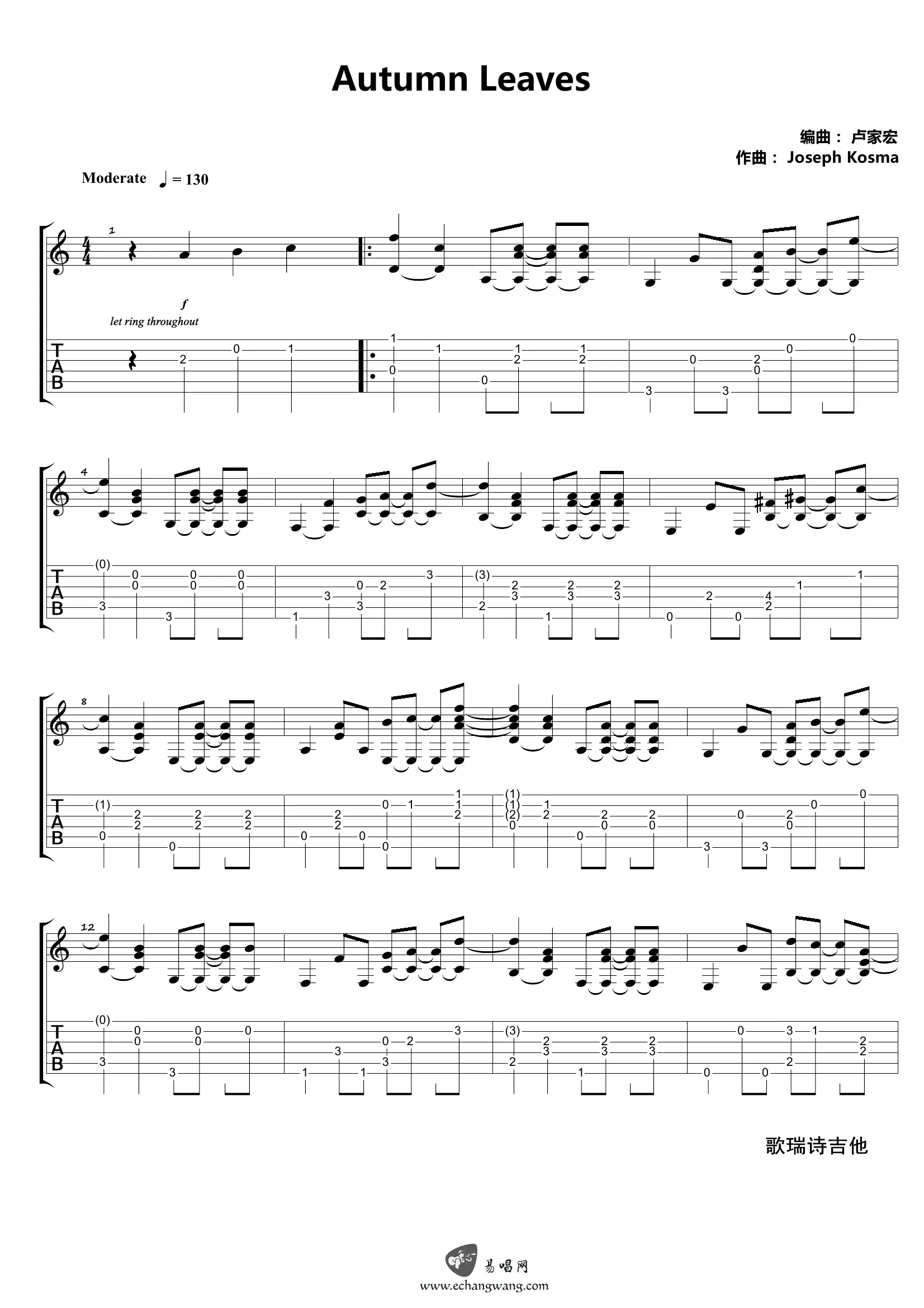 《Autumn Leaves》是由作曲家Joseph Kosma创作的法国香颂,后来作为电影《廊桥遗梦》的配乐被越来越多人所熟知,各种爵士改编版本都很有特色,下面带来的卢家宏的指弹版本,共2张图片谱。